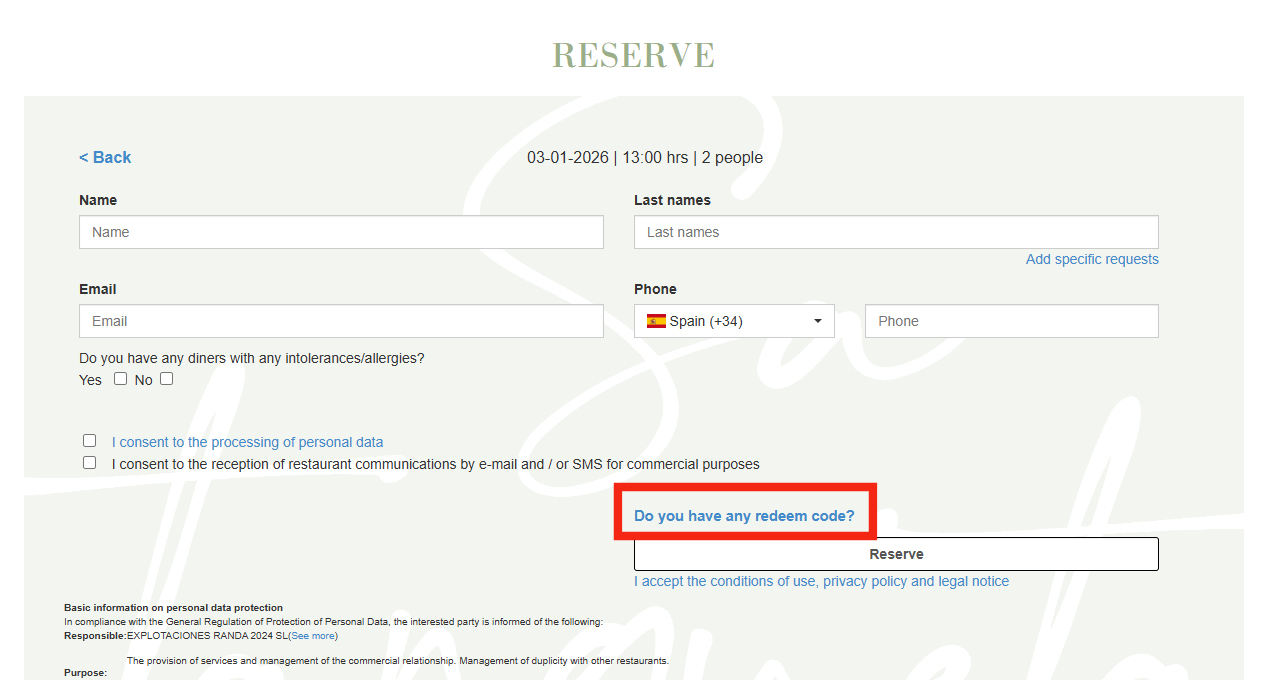 Each card has a unique code that can be used just before making the reservation, in the field “Do you have a redeem code?”